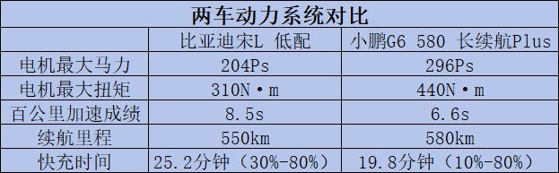总结:以上便是比亚迪宋l和小鹏g6这两款车型的一些对比介绍了,总体来说两款车型的各方面表现放在在同级别中来看均能够排在较为靠前的行列。不过,低配的比亚迪宋l和小鹏g6的580 长续航 plus版在经过详细对比后可以较为直观地看出,前者有着更为个性的外观设计,但后者在配置、动力和价格这三个方面会更占优势一些。