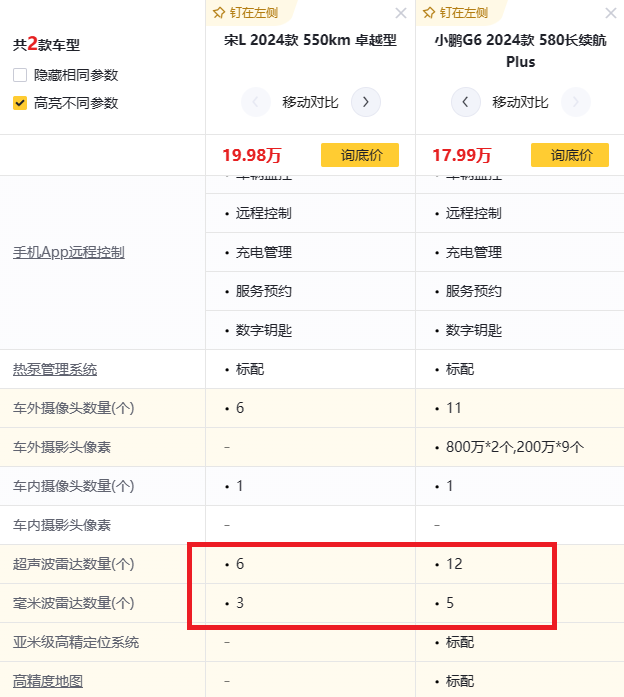 在智能驾驶方面,小鹏g6配备了双目前方感知摄像头,且搭载的超声波雷达有12个、毫米波雷达有5个,比亚迪宋l则搭载了6个超声波雷达和3个毫米波雷达。