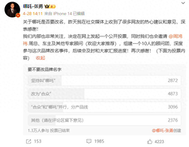 5 月 8 日消息,在周鸿祎的建议下,合众新能源汽车有限公司 ceo 张勇发起了一项投票调研,就“哪吒是否要改名”一事向所有用户公开征求意见,目前投票结果已经出炉,张勇本人也发视频讨论了这件事。