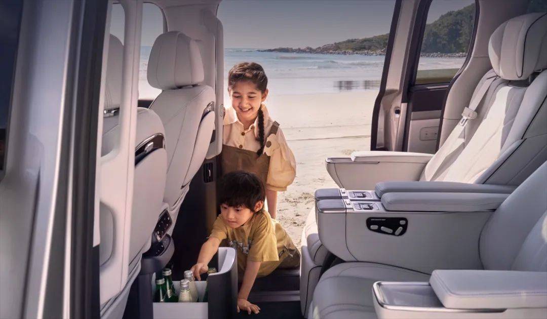 第二排全系标配两张功能强大的独立座椅,通风、按摩、加热、电动腿托应有尽有,车顶还配备了21.4英寸的触控大屏,供后排娱乐使用,还有10.8l容积电动开闭的冷暖箱,冷饮热饮随心选择。值得一提的还有,第三排座椅无论是调节还是折叠,也都是电动控制的,高级感满满。