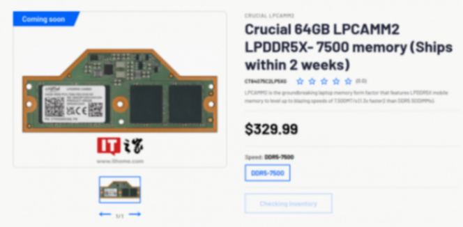 lpcamm2 内存仅提供 32gb 和 64gb 容量,64gb lpddr5x-7500 规格已上线美光j9com官网,定价 329.99 美元(it之家备注:当前约 2379 元人民币)。