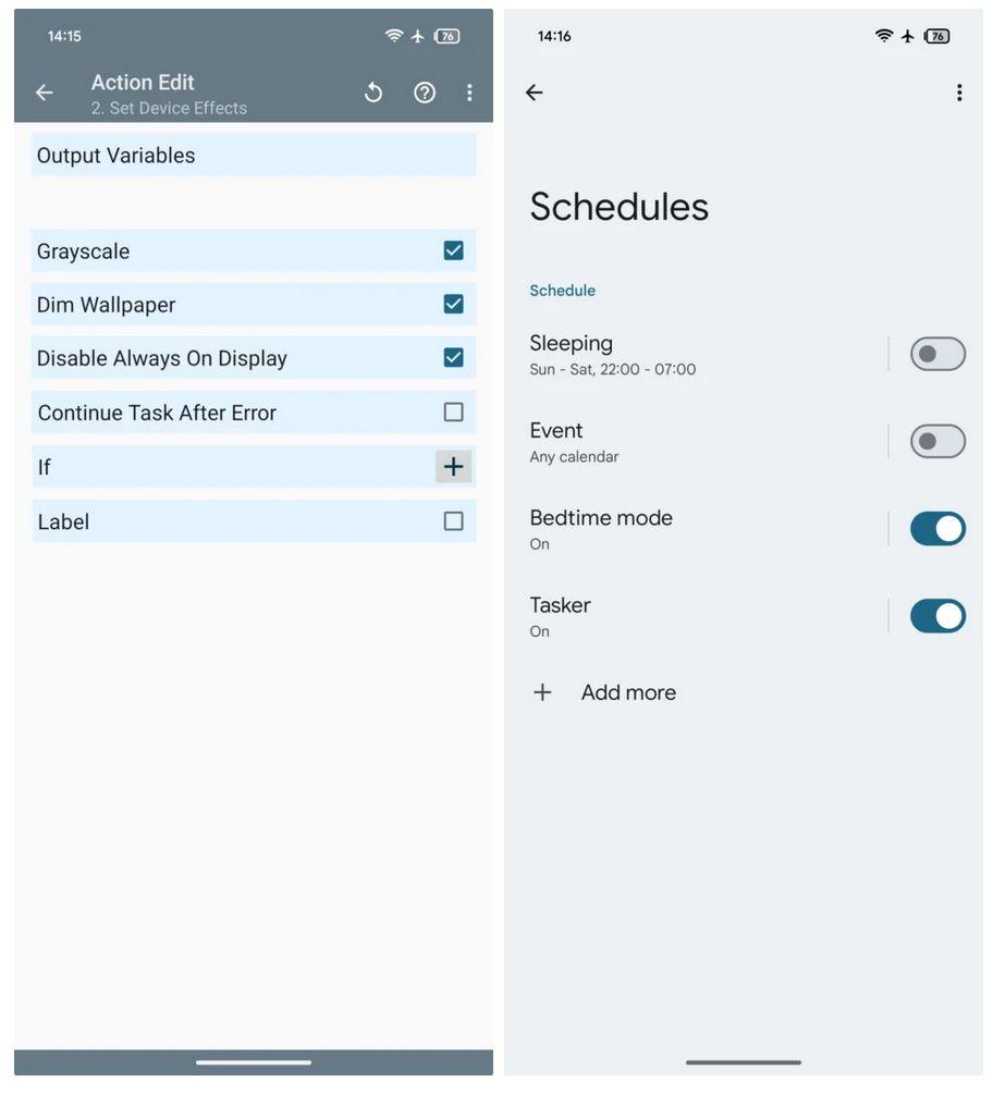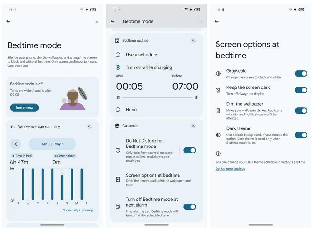 不过第三方应用无法更改谷歌数字健康应用程序在就寝模式期间的屏幕选项,无法调整屏幕饱和度、禁用 aod、调暗壁纸和启用深色模式等。